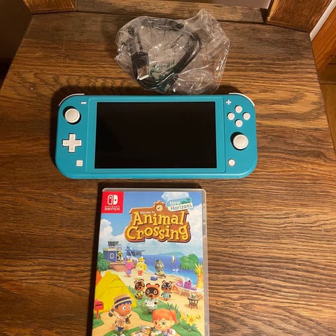 Nintendo Switch Lite konsol i blå färg med två spel: Pokémon Legends Arceus och Pokémon Scarlet. Konsolen är bärbar och passar för Nintendo Switch-spel.