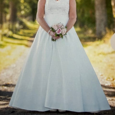 Ivory sidenklänning med paljett brodyr utmed släp och liv. Ca strl 42 för max 165 cm brud. Går att justera liv och axlar både ta in och släppa ut.