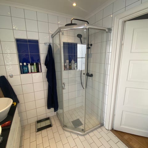 Duschhörna med frostat glas och metallram, inklusive duschhylla i metall för förvaring av duschprodukter. Passar badrum med behov av hörnduschlösning och extra förvaringsutrymme.