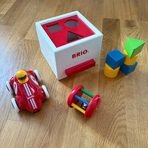 BRIO barnleksak med hjul i svart och rött. Leksaken är tillverkad i trä och plast och har runda hjul som är röda med vita detaljer. Lämplig för barn att leka med och utveckla motorik.