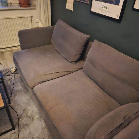 3-sits soffa Söderhamn från IKEA med 4 löstagbara ryggkuddar, två stora och två små. Se de två bilderna utan prydnadskuddar.