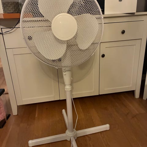 Fläkt med svart färg och metallgaller. Fläkten är av standardstorlek och har justerbar höjd. Passar för användning i hem eller kontor för luftcirkulation.