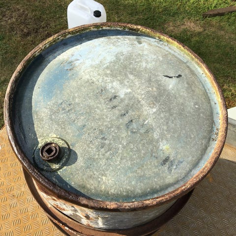 Fullt fungerande oljefat som kan användas smidigt för sitt avsedda syfte. Passar lika bra för praktisk användning som prydnad i trädgården, vid verkstad eller för industriell inredning.