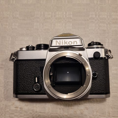 Nikon FE med tillhörande objektiv. Kameran använder film och är avsedd för fotografering.