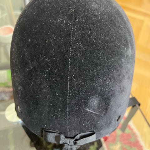 Svart ridhjälm i storlek 59 med justerbara remmar. Hjälmen har en mjuk yta och är utformad för ridning. Insidan är vadderad för komfort och skydd.