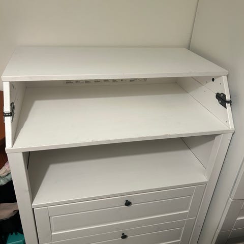 Vit byrå med fyra lådor i trämaterial. Passar för förvaring av kläder eller andra hushållsartiklar.