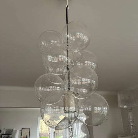 Glasskärmen har en vacker och rökigt grå färg, vilket ger lampan ett varmt sken.