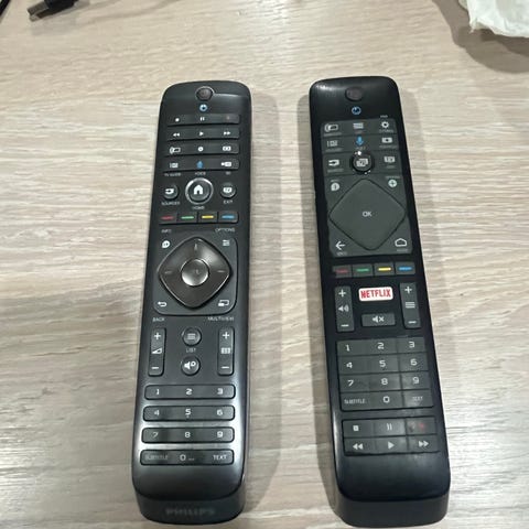 Samsung fjärrkontroll i grå färg. Utrustad med flera knappar för styrning av kompatibla enheter. Drivs av AAA-batterier (ingår).