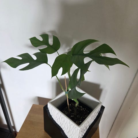 Monstera thai CONSTELLATION krukväxt med stora gröna blad med vita fläckar. Passar som inomhusväxt och kräver ljus men inte direkt solljus. Bladen har karakteristiska hål och fläckar som ger ett dekorativt utseende.