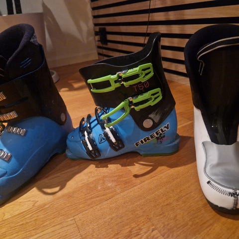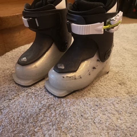 Använts av ett barn förra säsongen. En del repor i plasten (se bilder) men fodret (innerpjäxan) är fortfarande som nytt och summerat i 100% funktionsmässigts bra skick!