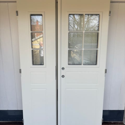 Ordentliga pardörrar i trä för fönster. Målat i gult. Rejäla gångjärn och låshake för hänglås. Cirkamått: 50x136 cm per dörr.
