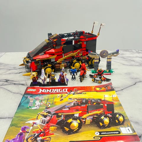 LEGO NINJAGO byggsats som innehåller ett större fordon med hjul och vapen, samt flera figurer i olika färger. Setet är tillverkat i plast och är en del av LEGO:s NINJAGO-serie. Finns även en stor "samuraj".