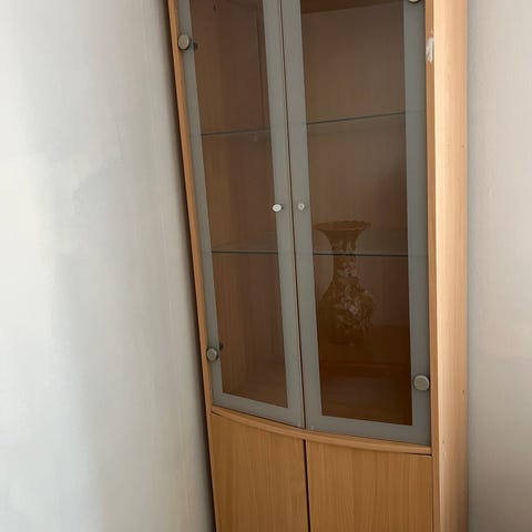 Förvaringsskåp med rejäl bordsskiva. Utdragbar träskiva. En låda saknas. Annars helt okey för att ha t.ex. i källaren.