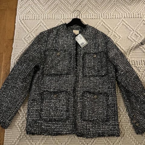 Grå kavaj med inslag av silvertrådar från by Malene Birger. Storlek 40. Benvita fickor i fram. Väldigt bra skick. Jag säljer även den matchande klänningen.