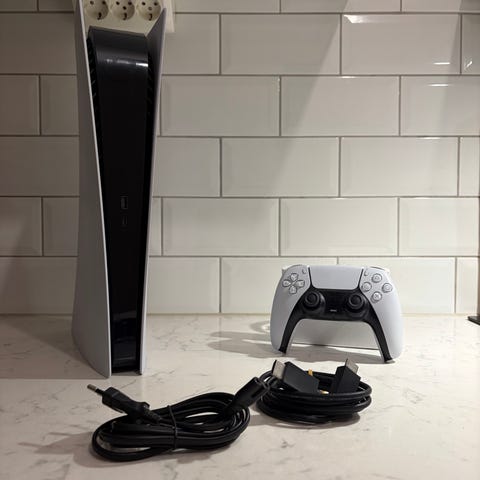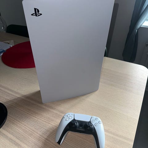 Sony Playstation 5 spelkonsol med en handkontroll och tillhörande kablar. Spelkonsolen är designad för att erbjuda spelupplevelser med hög prestanda och avancerad grafik.