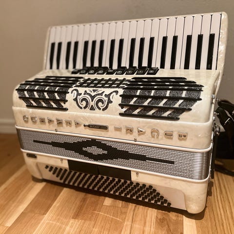 Begagnat Bugari "Seniorfisa" 4-körigt musette i mycket fint skick och med pärldekor!