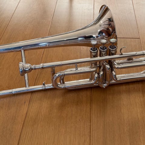 Conn 73 H bastrombon från ca 1975.14,27 m.m. Kvartsventil + en till för sänkning en halv ton till. Lacksläpp+litet nött där man håller vänster hand - se bilderna. Draget i utmärkt skick. Munstycken Conn 1½GM och 11/4G, Denis Wick 2AL och JK (Josef Klier) 1AK. Notgaffel. Ett par sordiner + rengöringsgrejor. Trombonställ K&M.