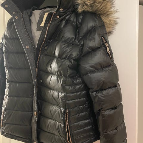 New Yorker vinterjacka i storlek S för kvinnor. Jackan är svart och tillverkad av polyester. Den har en vadderad design med dragkedja framtill och en huva med avtagbar fuskpäls. Den har jag använt två gånger efter köpet.