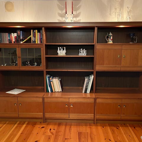Bokhylla trä med låsbart skåp och glas vitrinskåp.