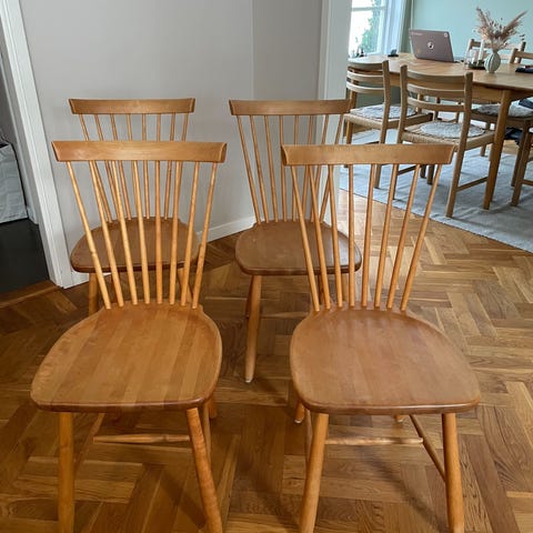 Alla behöver oljas då de stått i förråd flera år. En av stolarna har torrsprickor vilket en oljning kommer minska då de sväller något vid inoljning. Stolen är dock inte funktionsmässigt påverkad. Priset 6000 är för alla tre.