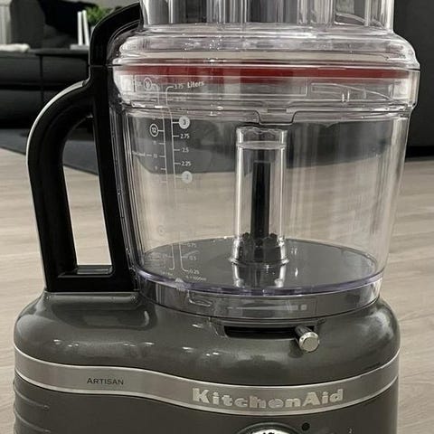 KitchenAid Artisan köksmaskin i matt svart färg med rostfri skål. Levereras med visp, degkrok, flatblandare samt skyddsplast för skål och tillbehör. Stänkskyddet är sprucket men lagat och påverkar inte funktionen.