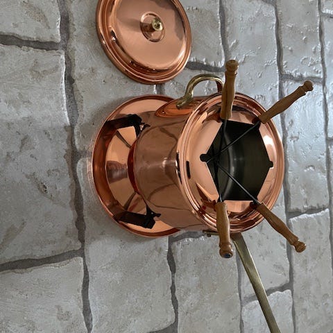 FONDEU-gryta med emaljerad insida. Brännare. 12 fondeu-gafflar medföljer.