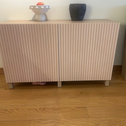 BESTÅ-förvaringsmöbel i mörk finish (svartbrun) med mässingsfärgade handtag och ben. Perfekt som sideboard, TV-bänk eller förvaring i vardagsrum, hall eller kontor.
