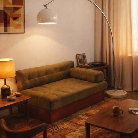 Soffan har ett charmigt tuftat säte och mjukt, beige/cremefärgat tyg med ett elegant etnisk mönster.
