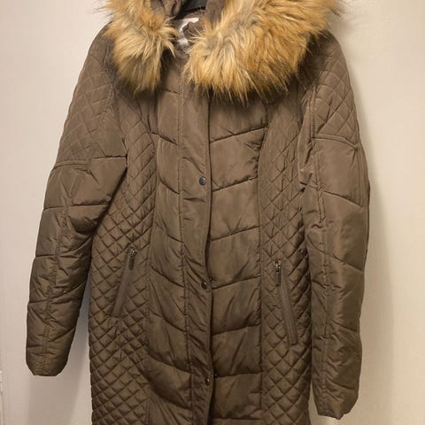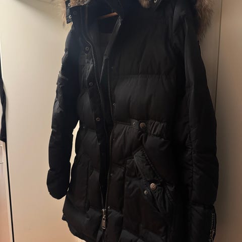Elegant jacka i mörkblått med detaljer i brunt läderimitation. Jackan har flera fickor med dragkedja och en avtagbar huva med fuskpäls. Kragen är i brunt läderimitation med dekorativa knappar. En stilfull detalj är märket på ärmen med en italiensk flagga.
