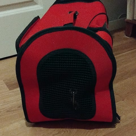 Svart med reflexer. 50 cm lång, 31 cm bred och 36 cm hög. Har använts till en kanin vid en resa.