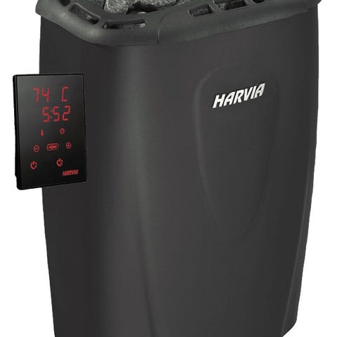 Harvia el bastuaggregat i cylindrisk design med tillhörande styrsystem och sten.