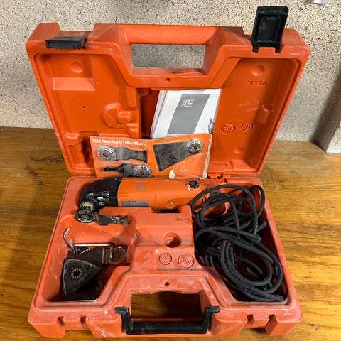 Fein MultiMaster Limited Edition multiverktyg med tillbehör i orange förvaringsväska. Verktyget är elektriskt och inkluderar flera blad och slipverktyg för olika användningsområden.