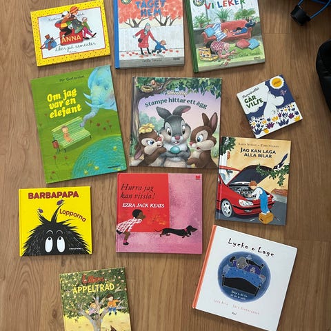 14 blandade barnböcker, bla Bockarna Bruse börjar skolan, Läskiga boken och någon faktabok. Säljs som ett paket för 100kr.