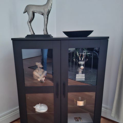 Innehåller två glashyllplan i vitrindelen och två trähyllplan i den nedre delen.