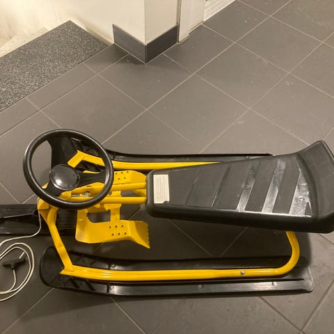 Snowracer i blå plast utrustad med dragrep. Den är en minde modell.