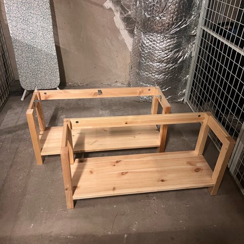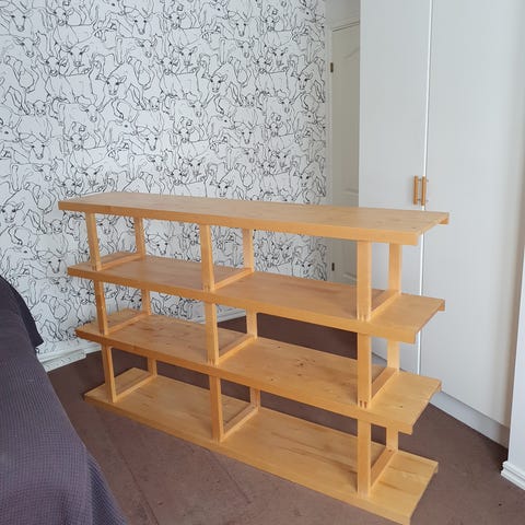 Hylla i furu med tillhörande flaskställ, tillhör hyllsystem IVAR från Ikea.