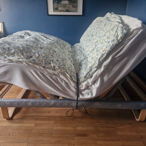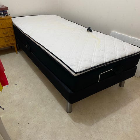 Justerbar säng (både rygg och ben) med fjärrkontroll. Bäddmadrass ingår ej. Behöver hämtas lördag 10 januari, eftermiddag, i Näsbydal, Täby.