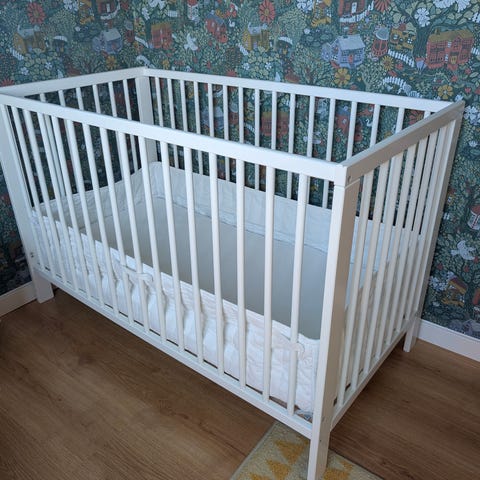 IKEA Spjälsäng i vit färg, designad för barn. Tillverkad av trämaterial med en enkel och funktionell design. Wellpur madrass