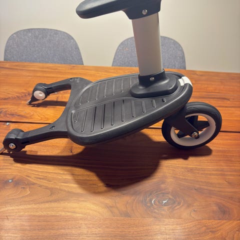 Bugaboo ståbräda med sittplats för barn. Tillbehör som fästs på barnvagn för att barnet ska kunna stå eller sitta. Tillverkad i svart material med hjul och fotstöd.
