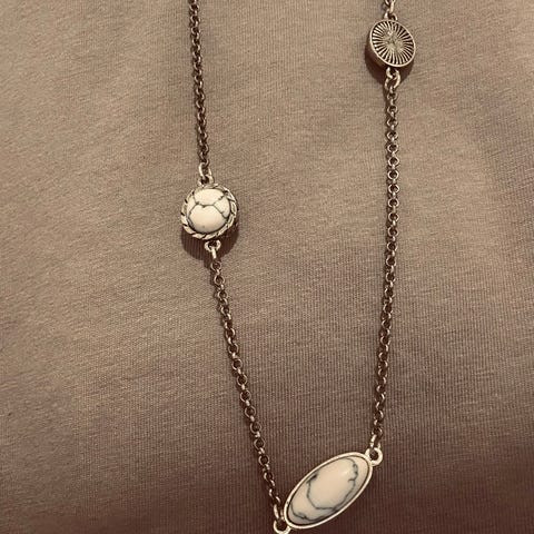 Silverhalsband med inslag av halvädelstenar turkos tror jag,designat för kvinnor. Halsbandet består av flera detaljerade silverplattor och dekorerade sektioner med blågröna halvädelstenar. Lås med stämpel 925 som indikerar äkta silver.