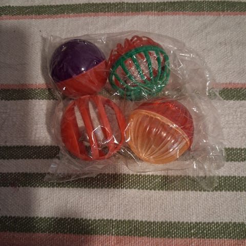 Köpte de för att jag hade ett husdjur men de kom efter jag tyvärr behövde omplacera honom. Det är 6 rullar plastpåsar och 6 mössleksaker. Man ser allt på bild.