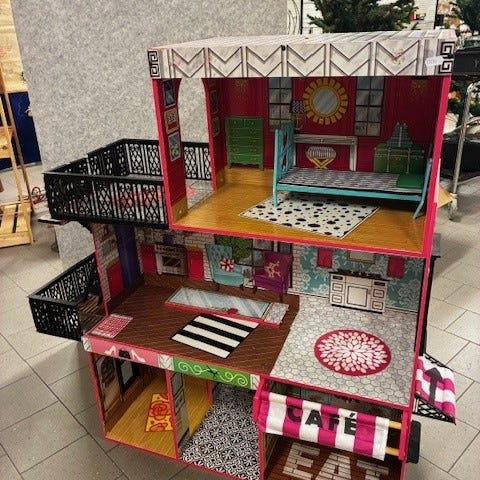 Stort trä‑dockhus med 4 våningar och 8 rum.