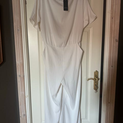 Vit byxdress för dam i storlek XL. Plagget har axelband och utskurna ärmar med dekorativa hålmönster. Midjan är resårförsedd för passform.