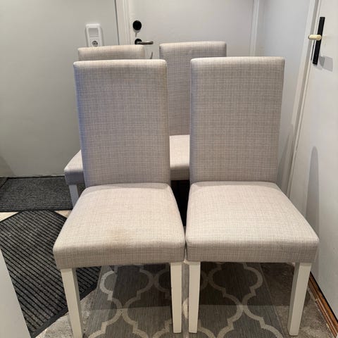 Vi säljer 6 st stolar från Mio. De är i gråmelerad färg och är något ljusare än på bilden. Använt men gott skick från ett djur- och rökfritt hem.