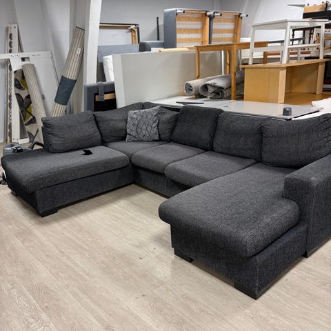 Vi säljer denna gråa soffan med duvan! Den har lite slitage i form av missfärgningar här och där, men annars funkar den fint! Och tyget är avtagbart.