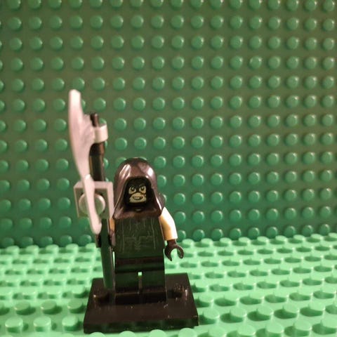LEGO Star Wars minifigur med svart hjälm och cape, utrustad med grön ljussabel. Figuren är en del av LEGO:s Star Wars-tema och är tillverkad i plast. Äkta lego allt som finns i bilden ingår.