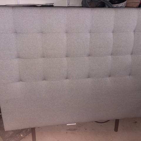 Fristående sänggavel i mycket gott skick, byggd i september 2025. Vadderad stabil skiva klädd i slitstarkt mörkgrått tyg med linnekänsla.