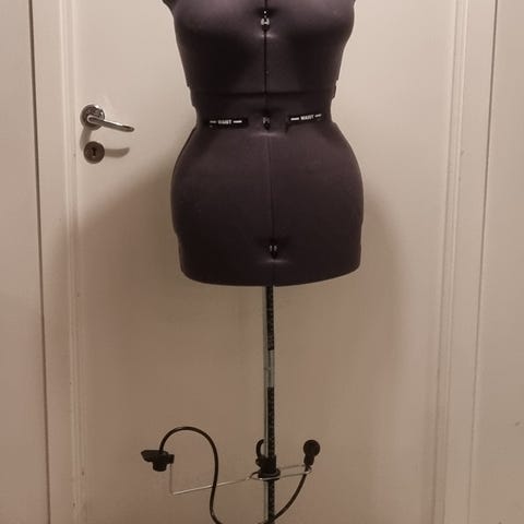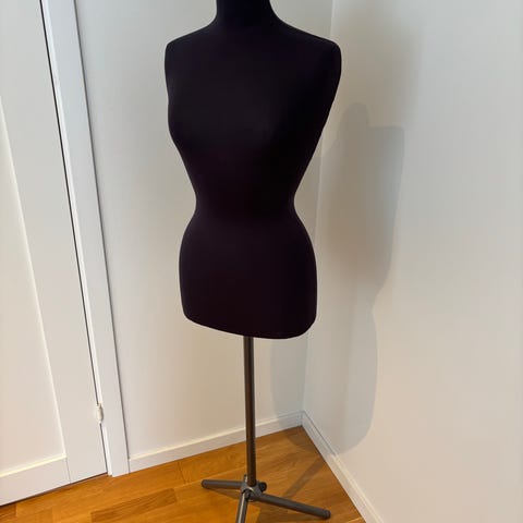 Mannekäng/provdocka med svart trästativ. Används för att visa eller prova kläder. Har justerbar höjd och stabilt stativ med tre ben.Höjd 160 cm