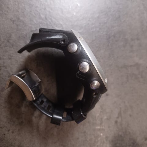 Den är i bra skick och fungerar som den ska förutom att plastbandet som håller fast armbandet har gått sönder och finns ej kvar.