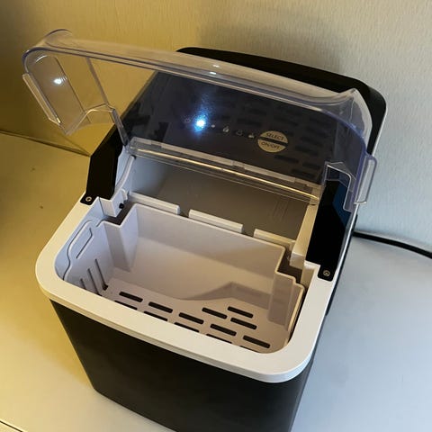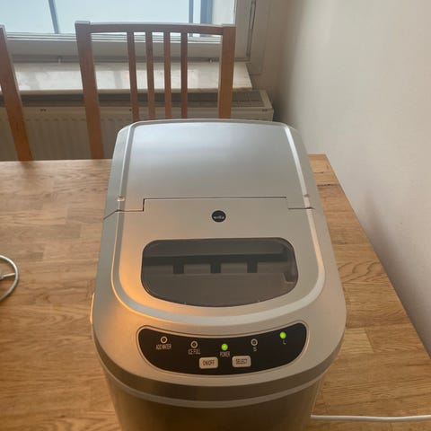 Princess ismaskin i rostfritt stål med digital display och kontrollpanel. Kompakt design med strömkabel och stickkontakt. Lämplig för hemmabruk för att tillverka isbitar.